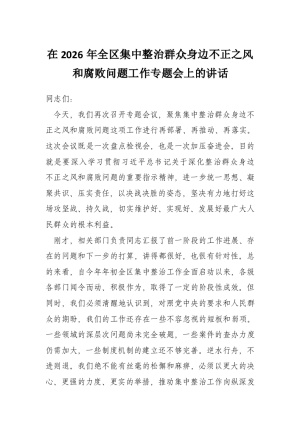 在2026年全区集中整治群众身边不正之风和腐败问题工作专题会上的讲话