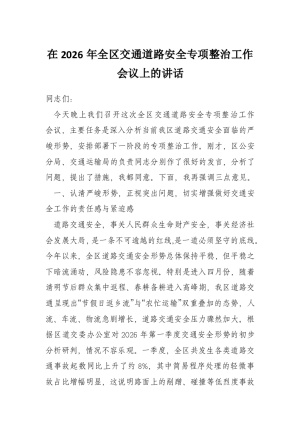 在2026年全区交通道路安全专项整治工作会议上的讲话