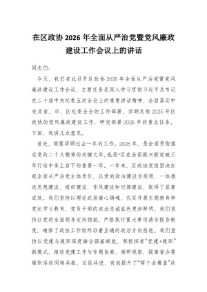 在区政协2026年全面从严治党暨党风廉政建设工作会议上的讲话