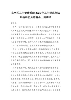 在全区卫生健康系统2026年卫生规范执法年活动动员部署会上的讲话