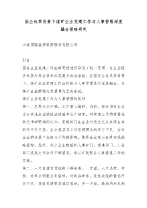 国企改革背景下煤矿企业党建工作与人事管理深度融合策略研究