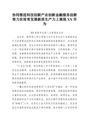 协同推进科技创新产业创新金融服务创新努力在培育发展新质生产力上展现XX作为
