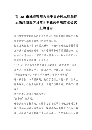 在 XX 市城市管理执法委员会树立和践行正确政绩观学习教育专题读书班结业仪式上的讲话