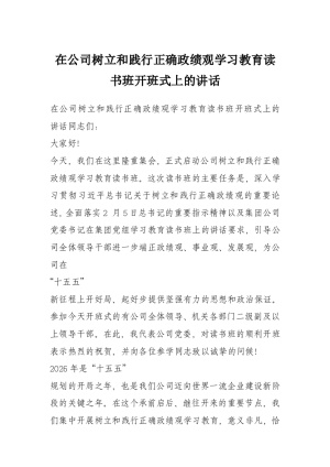 在公司树立和践行正确政绩观学习教育读书班开班式上的讲话