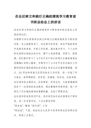 在全区树立和践行正确政绩观学习教育读书班总结会上的讲话