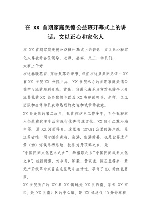 在 XX 首期家庭美德公益班开幕式上的讲话:文以正心和家化人