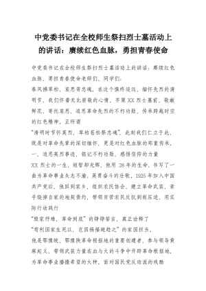 中党委书记在全校师生祭扫烈士墓活动上的讲话:赓续红色血脉,勇担青春使命