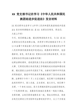 XX 党支部书记在学习《中华人民共和国民族团结进步促进法》发言材料