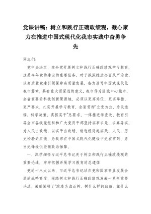党课讲稿:树立和践行正确政绩观,凝心聚力在推进中国式现代化我市实践中奋勇争先