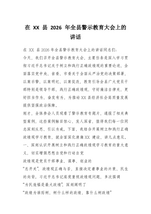 在XX县2026年全县警示教育大会上的讲话