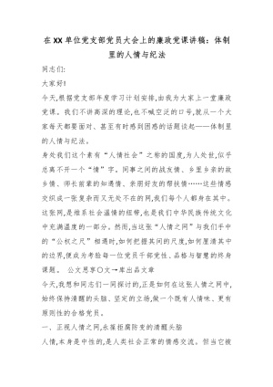 在XX单位党支部党员大会上的廉政党课讲稿:体制里的人情与纪法