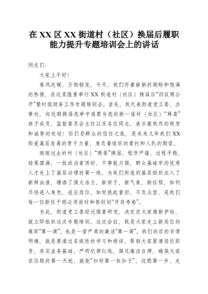在XX区XX街道村(社区)换届后履职能力提升专题培训会上的讲话