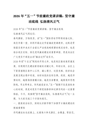 2026年“五一”节前廉政党课讲稿:坚守廉洁底线 弘扬清风正气