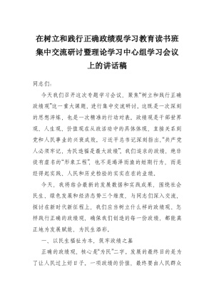 在树立和践行正确政绩观学习教育读书班集中交流研讨暨理论学习中心组学习会议上的讲话稿