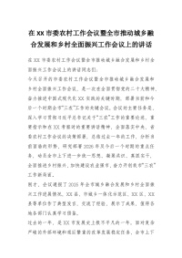 在XX市委农村工作会议暨全市推动城乡融合发展和乡村全面振兴工作会议上的讲话