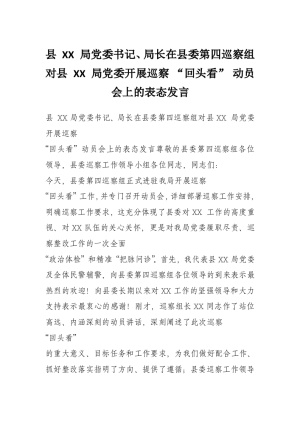 县 XX 局党委书记、局长在县委第四巡察组对县 XX 局党委开展巡察 “回头看” 动员会上的表态发言