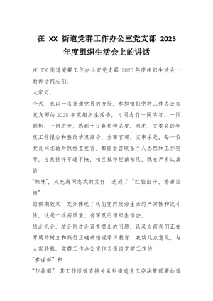 在 XX 街道党群工作办公室党支部 2025 年度组织生活会上的讲话