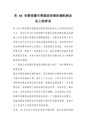 在 XX 市委党建引领基层治理协调机制会议上的讲话