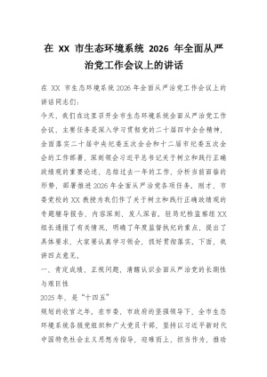 在 XX 市生态环境系统 2026 年全面从严治党工作会议上的讲话