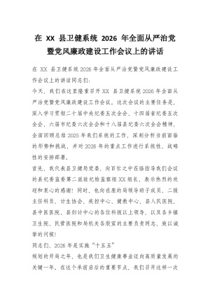 在 XX 县卫健系统 2026 年全面从严治党暨党风廉政建设工作会议上的讲话