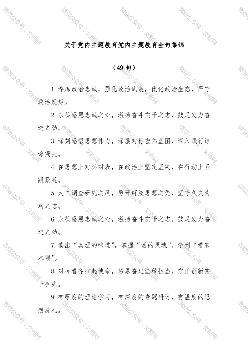 微信公众号:文档网微信公众号微信公众号:文档微信公众号:文档网信文档关于党内主题教育党内主题教育金句集锦微信公众号(49句)微信公众1.淬炼政治忠诚,强化政治武装,档网档网文档网2.永葆感恩忠诚之心,激扬奋斗实干之志,鼓足发力奋微信公众号:文档网进之劲。微信微信3.深刻感悟思想伟力,深层对标宏伟蓝图,深入践行谆嘱托。文档网文档网4.在思想上对标对表,在政治上坚定坚决,在行动上紧跟紧随。微信公众号:文档网5.大兴调查研究之风,勇开解放思想之先,坚守久久为功之志。众号众号6.永葆感恩忠诚之心,激扬奋斗实之志,鼓足发力奋进之劲。7.读出“真理的味道”,掌握“活的灵魂”,学到“看家微信公众号:文档网本领公众号公公众9.有厚度的理论学习,有深度的专题研讨,有温度的思微信公众号:文档网想洗礼。微信公众号:文档网微信公众号:文档网微信公众号:文档网