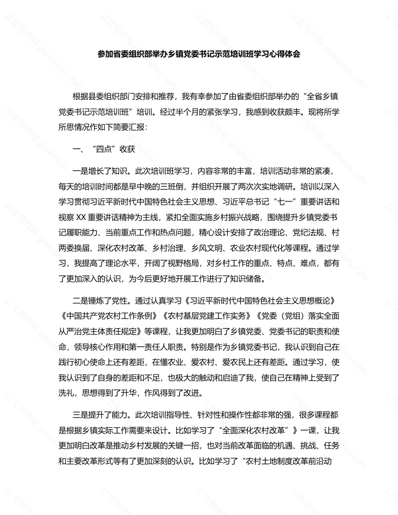首页写作素材参加省委组织部举办乡镇党委书记示范培训班学习心得体会