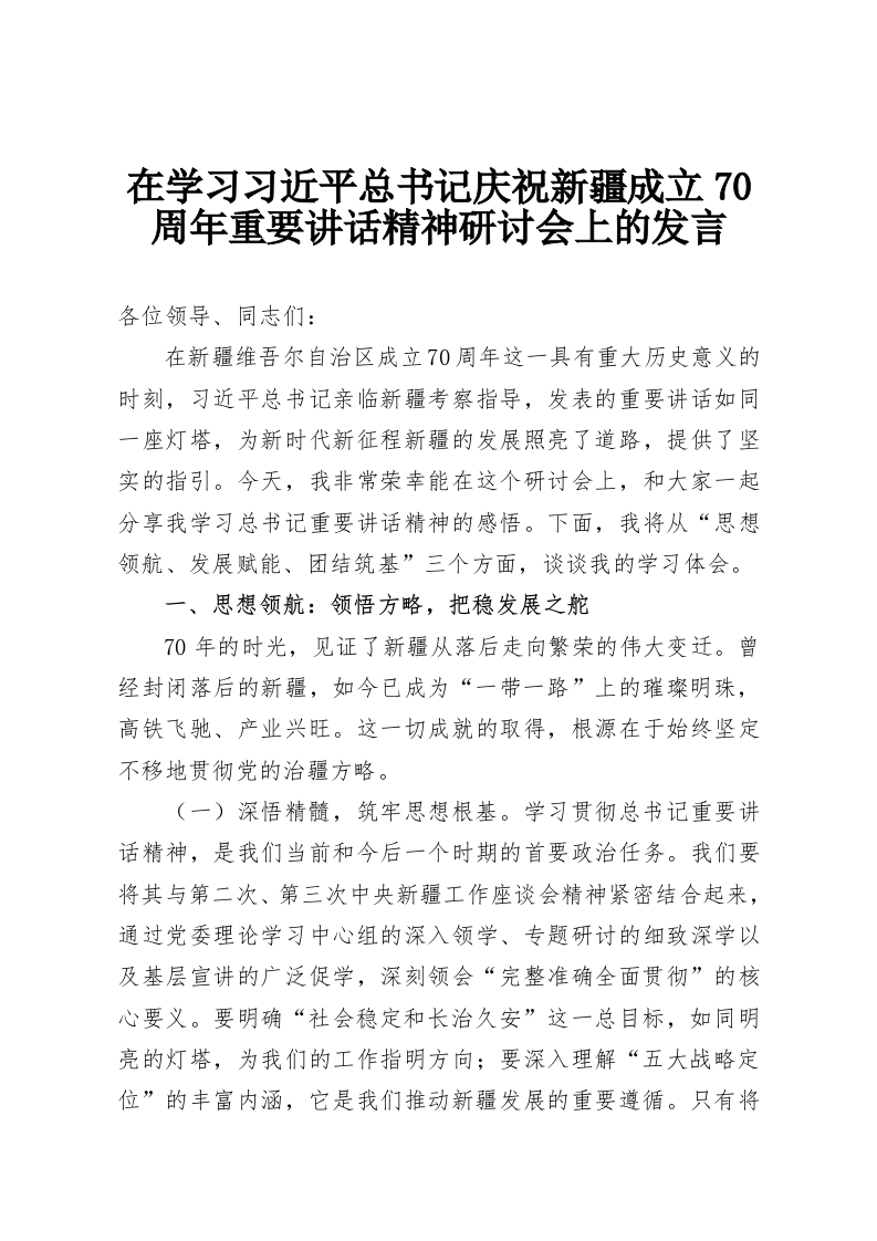 在学习***总书记庆祝新疆成立70周年重要讲话精神研讨会上的发言