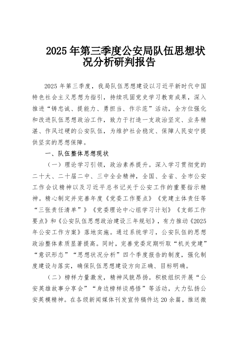 首页工作文档2025年第三季度公安局队伍思想状况分析研判报告