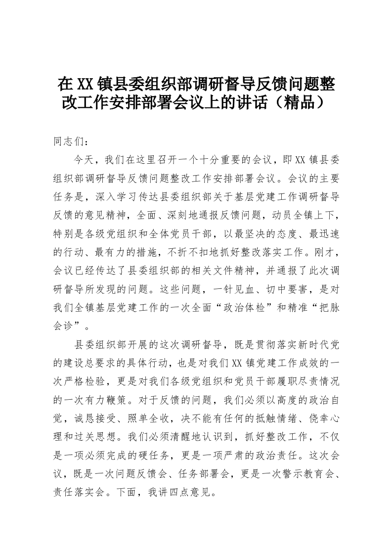 在XX镇县委组织部调研督导反馈问题整改工作安排部署会议上的讲话(精品)