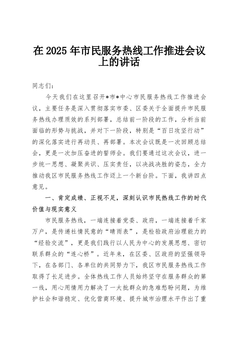 在2025年市民服务热线工作推进会议上的讲话