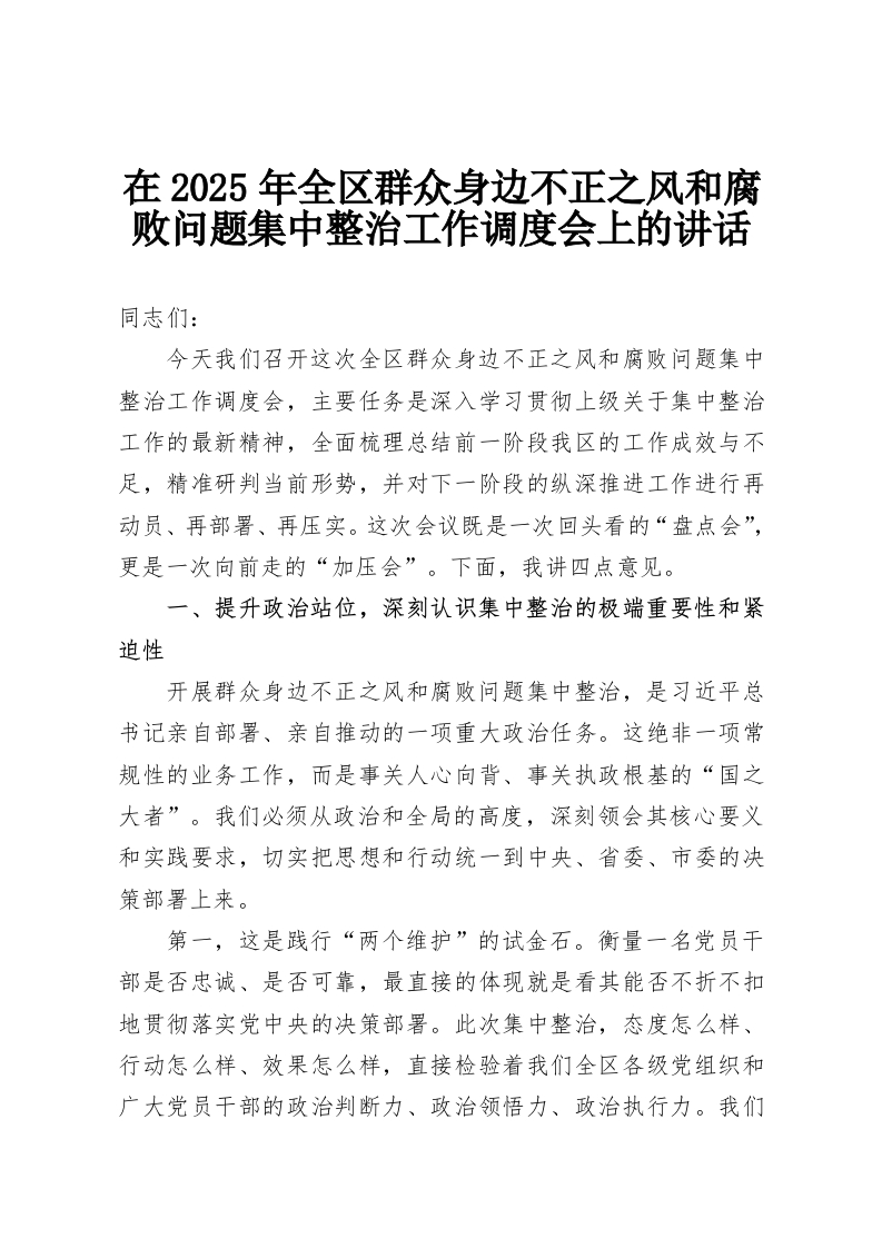 在2025年全区群众身边不正之风和腐败问题集中整治工作调度会上的讲话
