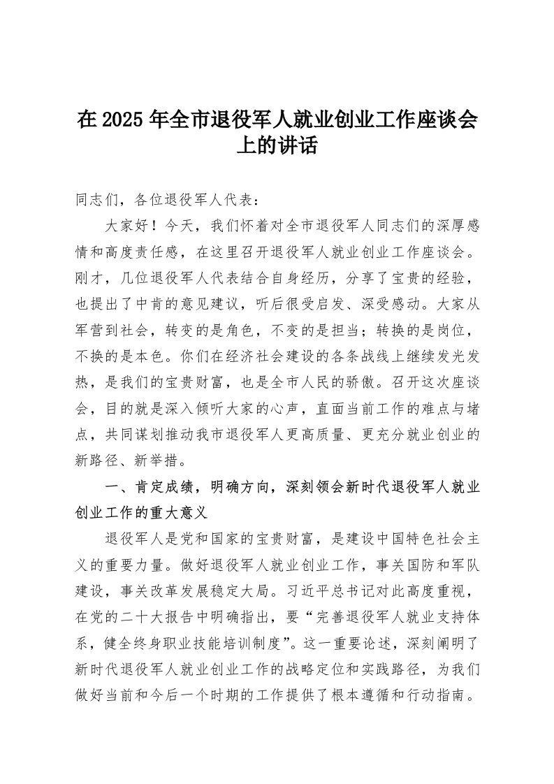 在2025年全市退役军人就业创业工作座谈会上的讲话