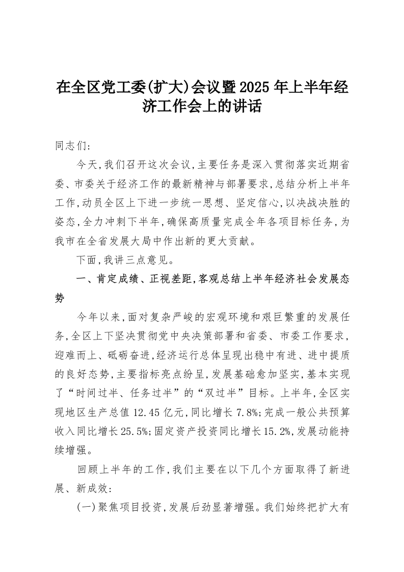 在全区党工委(扩大)会议暨2025年上半年经济工作会上的讲话
