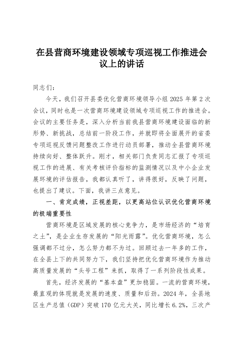 在县营商环境建设领域专项巡视工作推进会议上的讲话