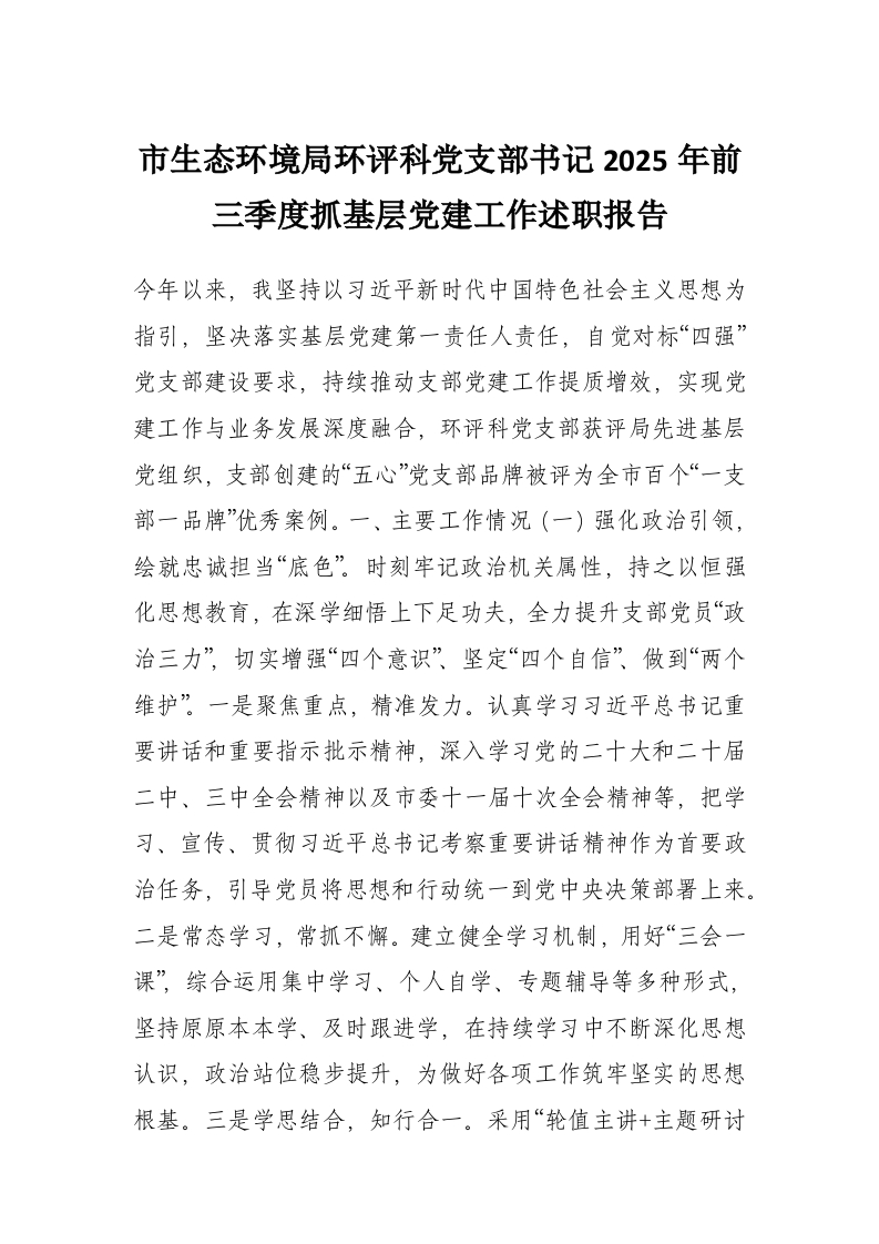 市生态环境局环评科党支部书记2025年前三季度抓基层党建工作述职报告