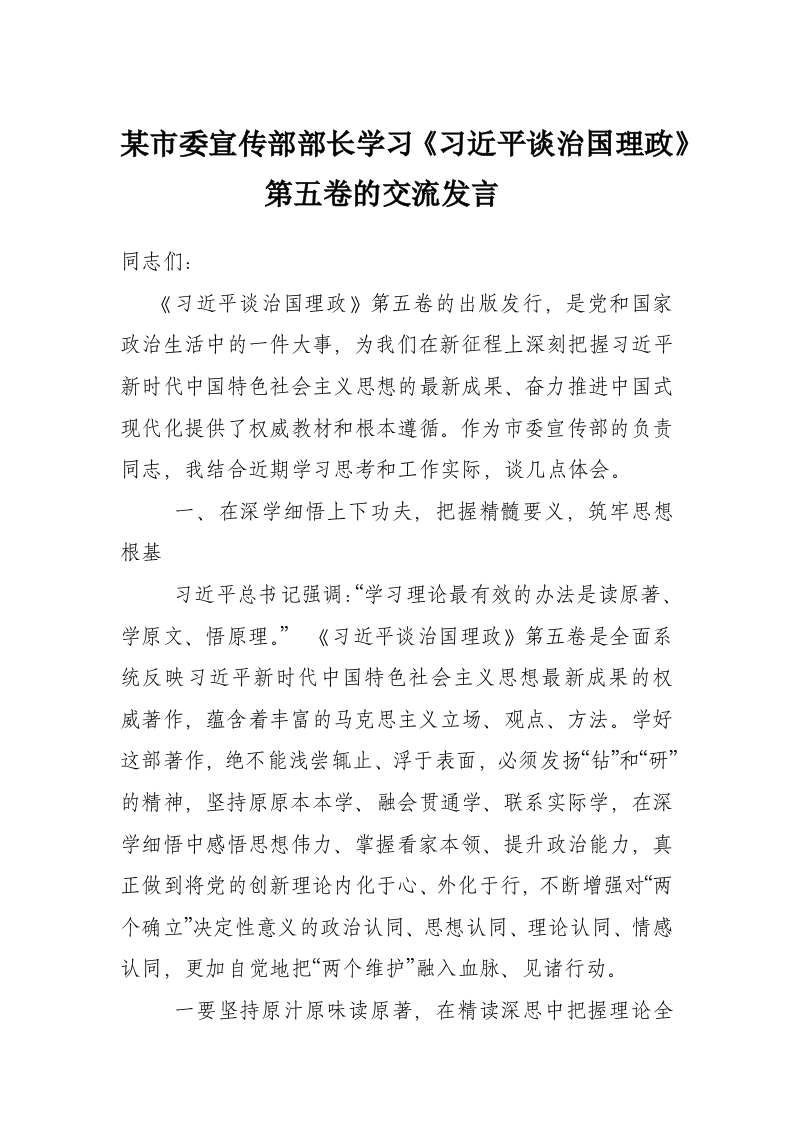 某市委宣传部部长学习《***谈治国理政》第五卷的交流发言​