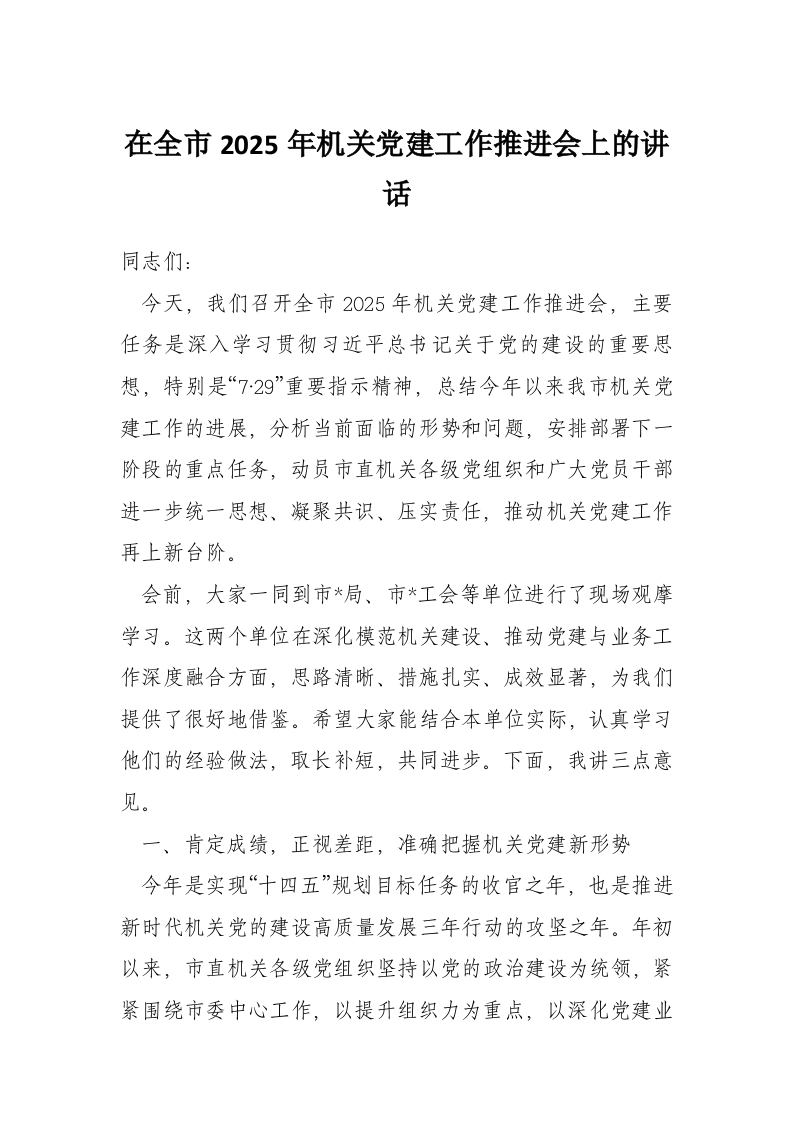 在全市2025年机关党建工作推进会上的讲话
