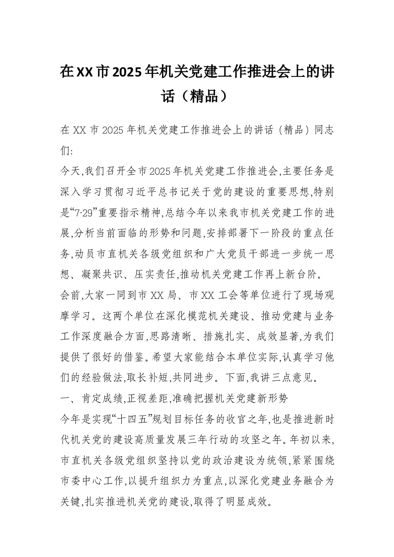 在XX市2025年机关党建工作推进会上的讲话(精品)