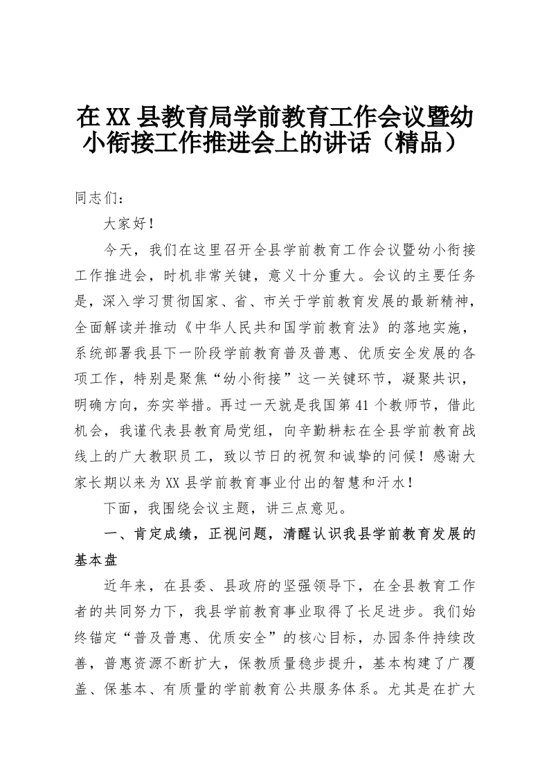 在XX县教育局学前教育工作会议暨幼小衔接工作推进会上的讲话(精品)