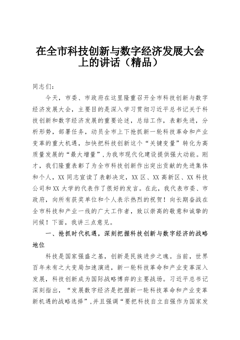 在全市科技创新与数字经济发展大会上的讲话(精品)