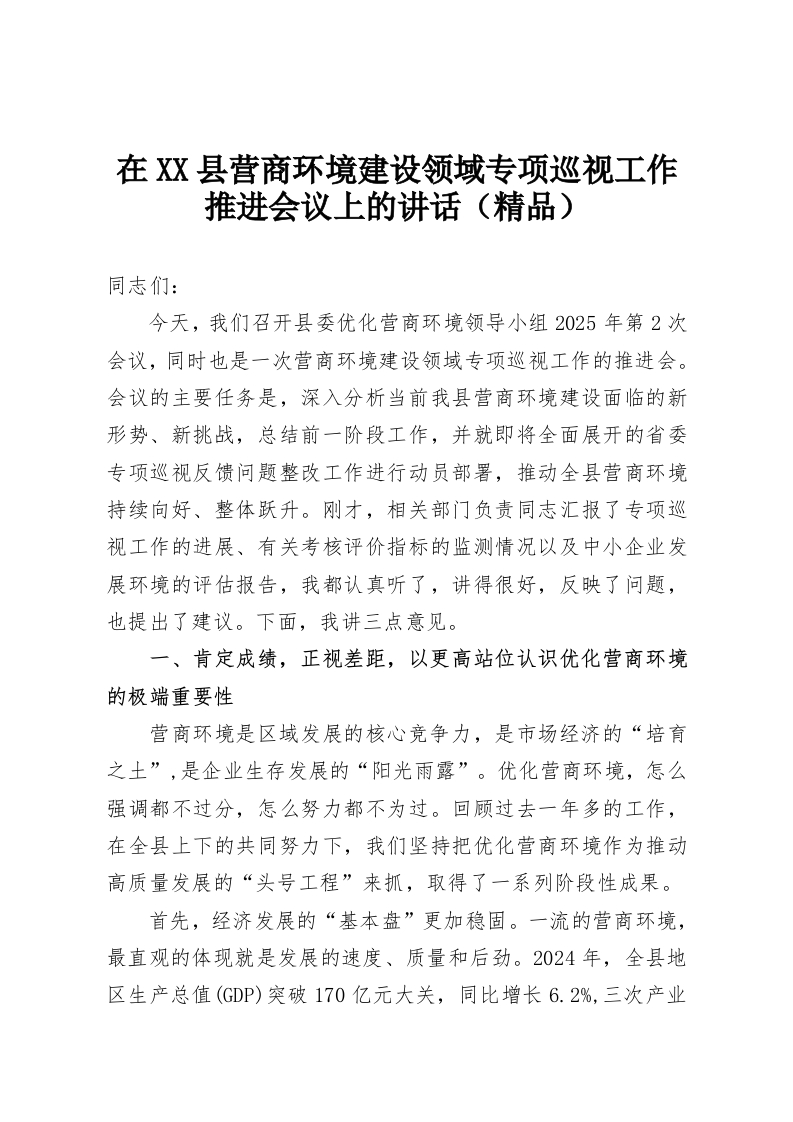 首页工作文档在XX县营商环境建设领域专项巡视工作推进会议上的讲话(精品)