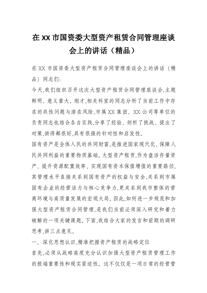 首页精选范文在XX市国资委大型资产租赁合同管理座谈会上的讲话(精品)