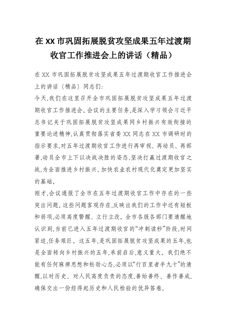 在XX市巩固拓展脱贫攻坚成果五年过渡期收官工作推进会上的讲话(精品)