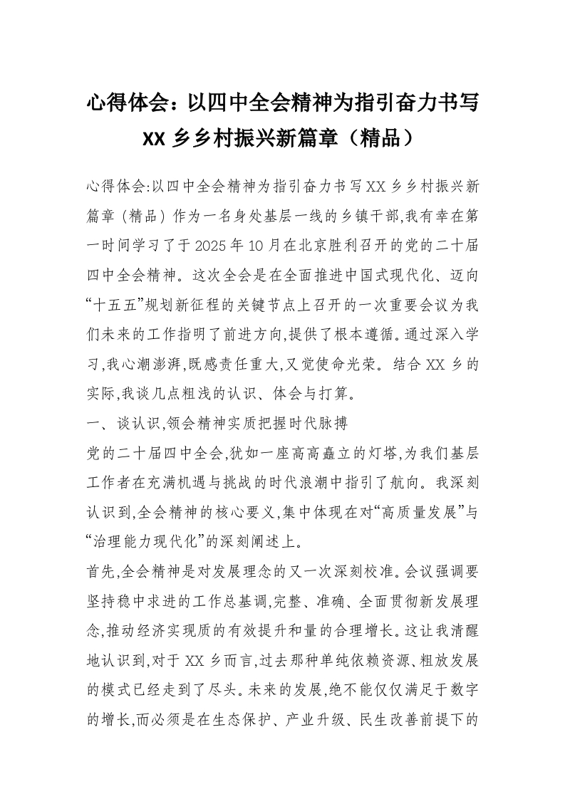 心得体会:以四中***精神为指引奋力书写XX乡乡村振兴新篇章(精品)