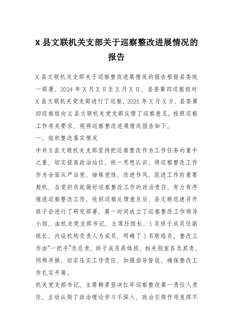 首页写作素材X县文联机关支部关于巡察整改进展情况的报告
