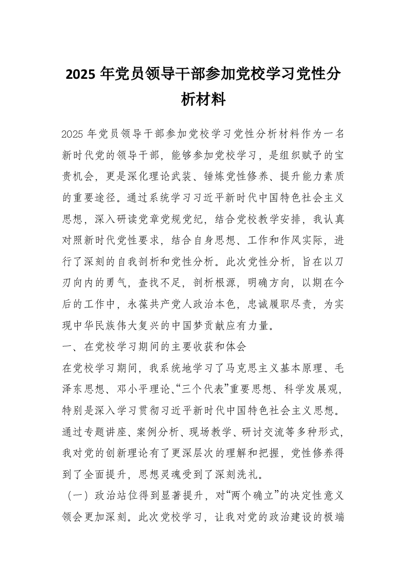 2025年党员领导干部参加党校学习党性分析材料