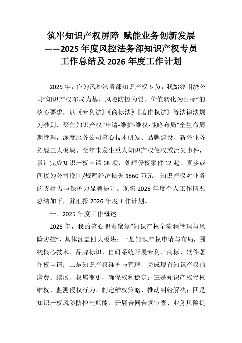 首页工作文档筑牢知识产权屏障 赋能业务创新发展——2025年度风控法务部知识产权专员工作总结及2026年度工作计划_副本