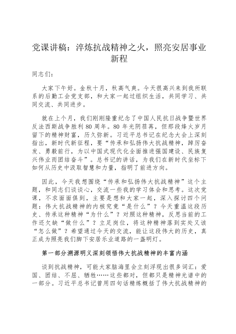 党课讲稿:淬炼抗战精神之火,照亮安居事业新程
