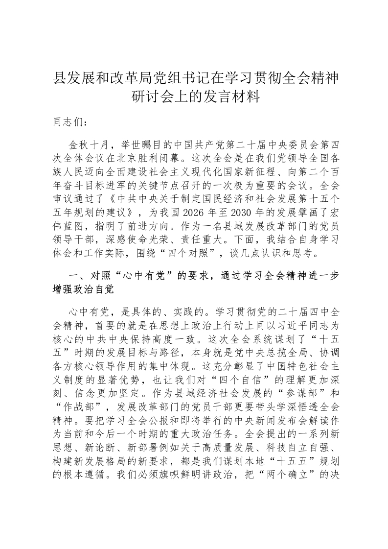 首页材料汇编县发展和改革局党组书记在学习贯彻***精神研讨会上的发言材料