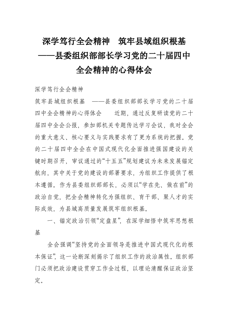 深学笃行***精神 筑牢县域组织根基 ——县委组织部部长学习党的二十届四中***精神的心得体会